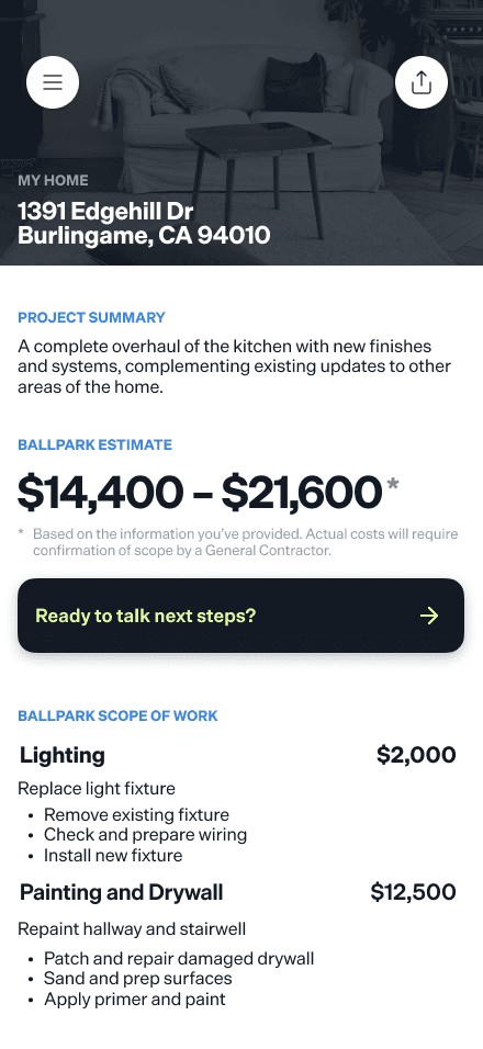 Homeowners start by recording a video of their space and describing their renovation ideas in plain language. Using AI, Spacelift turns that input into a structured project scope and ballpark budget — so you can explore your options and get smart about your project without any pressure to commit.
